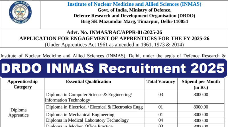 Read MoreDRDO INMAS Apprentice Recruitment 2025 : Defense Research and Development Organization – Institute of Nuclear Medicine and Allied Science (DRDO