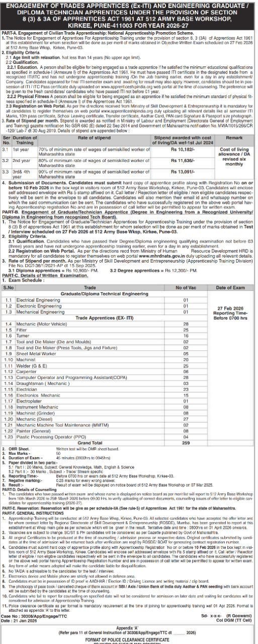 512 Army Base Workshop Apprentice Recruitment 2026: 512 Army Base Workshop Pune invite application for the post of apprentice. 512 Army base workshop apprentice recruitment 2026 for ITI Pass candidates. 512 Army Base Workshop Apprentice 2026 for ITI Diploma and Graduate candidates also. 512 Army Base Workshop Apprentice 2026 on total 259 vacancies. 512 Army Base Workshop Apprentice 2026 application apply offline before 10th Feb 2026. 512 Army Base Workshop Apprentice Notification given below. for More updates and Applications join our telegram channel. Click Here