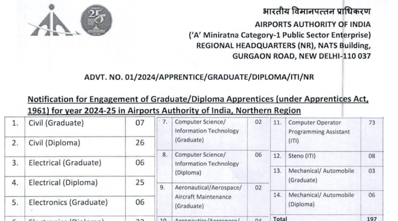- Airports Authority of India, Regional Headquarter (Northern Region) is inviting applications from the eligible candidates who are domiciles of Chandigarh, Delhi, Haryana, Himachal Pradesh, Jammu & Kashmir,Leh Ladakh, Madhya Pradesh, Punjab, Rajasthan, Uttar Pradesh, Uttarakhand for an Apprenticeship Training Program of one year in various airports in Northern Region for the year 2024-25.
