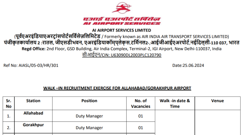 AIASL Allahabad Airport Recruitment 2024: AIASL Recruitment 2024: Air India Air Transport Services Limited (AIATSL), now known as AI Airport Services Limited (AIASL), has released a notification for the recruitment of 63 posts of Customer Service Executive, Handyman, Handywoman, Ramp Service Executive, and other vacancies on a fixed-term contract basis. Interested candidates who meet the eligibility criteria can read the notification and attend the walk-in interview. AIASL Allahabad, Gorakhpur Recruitment 2024 Date of Walk-in Interview: 09-07-2024 to 13-07-2024 (09:30 hours to 12:30 hours).