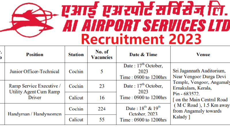 Air India airport services limited recruitment 2023: AI AIRPORT SERVICES LIMITED (formerly known as Air India Air Transport Services Limited) wishes to fill in existing vacancies and maintain a wait-list for vacancies arising in future. Indian Nationals (Male & Female) who meet with the requirements stipulated as mentioned herein, may apply for various posts at Cochin and Calicut International Airport posts on a Fixed Term Contract basis (3 Years) which may be renewed subject to their performance and the requirements of the AI Airport Services Limited, “Internal Candidates also may be apply”. The Number of vacancies given above are indicative and may vary as per the operational requirement.
