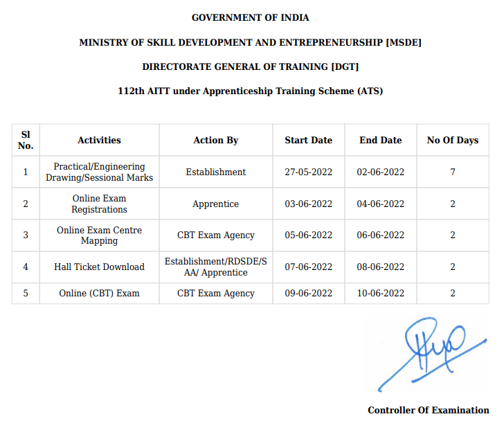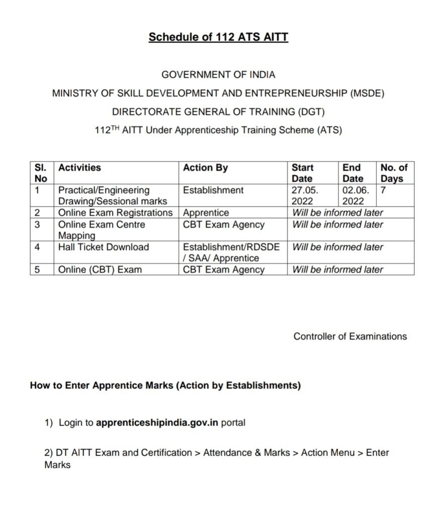 Railway और भारत में कही से apprentice करने पर DGT सभी का CBT Exam लेते हैं । DGT प्रत्येक वर्ष AITT ( All India Trade Test) की परीक्षा लेती है । अभी Act Apprentice का 111 batch तक परीक्षा हो चुकी है । 2022 में AITT की 112 Batch की परीक्षा होने वाली है । DGT ने AITT के परीक्षा का Schedule जारी कर दिया है फिलहाल Apprentice के Practical और Engineering Drawing के marks को upload करने का date जारी किया है । बाकी Exam form, Admit Card, CBT Exam date अभी जारी हुई है | AITT 112 का Exam form और बाकि का Date निचे दिया गया है |
