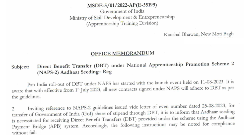 Apprentice New Rules Implemented from 01-04-2024: Pan India roll-out of DBT under NAPS has started with the launch event held on 11-08-2023. It is aware that with effective from 1″ July 2023, all new contracts signed under NAPS will adhere to DBT as per the guidelines. Inviting reference to NAPS-2 guidelines issued vide letter of even number dated 25-08-2023, for transfer of Government of India (Gol) share of stipend through DBT, it is to inform that Aadhaar seeding is necessitated for receiving Direct Benefit Transfers (DBT) provided under the scheme using the Aadhaar Payment Bridge (APB) system. Accordingly, the following instructions may be noted for compliance without fail: