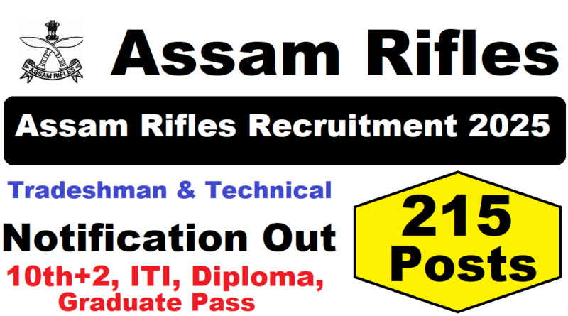 Assam Rifles Recruitment 2025 : The Assam Rifles Tradesmen की ओर से 215 Posts पर Recruitment निकली है जिसका Online form 22/02/2025 से शुरू है |Assam Rifles Recruitment 2025 Online form 22/03/2025 तक भरा जायेगा |10th + ITI /Diploma/ Graduate pass in various candidates Assam Rifles Recruitment 2025 online form भर सकता है | Interested and eligible candidates Assam Rifles Recruitment form भर सकते हैं |Assam Rifles Recruitment Full Notification निचे दिया गया हैI Assam Rifles Recruitment 2025 Apply Link निचे दिया गया है I