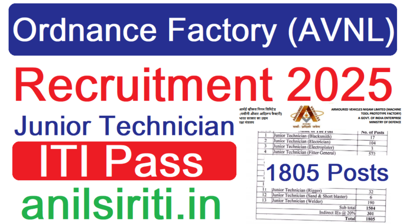 AVNL Junior Technician Recruitment 2025, 1805 Posts, ITI Pass latest vacancy 2025