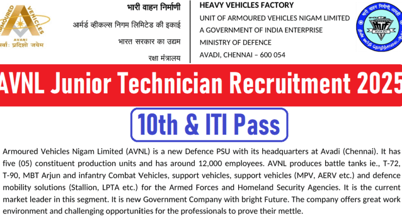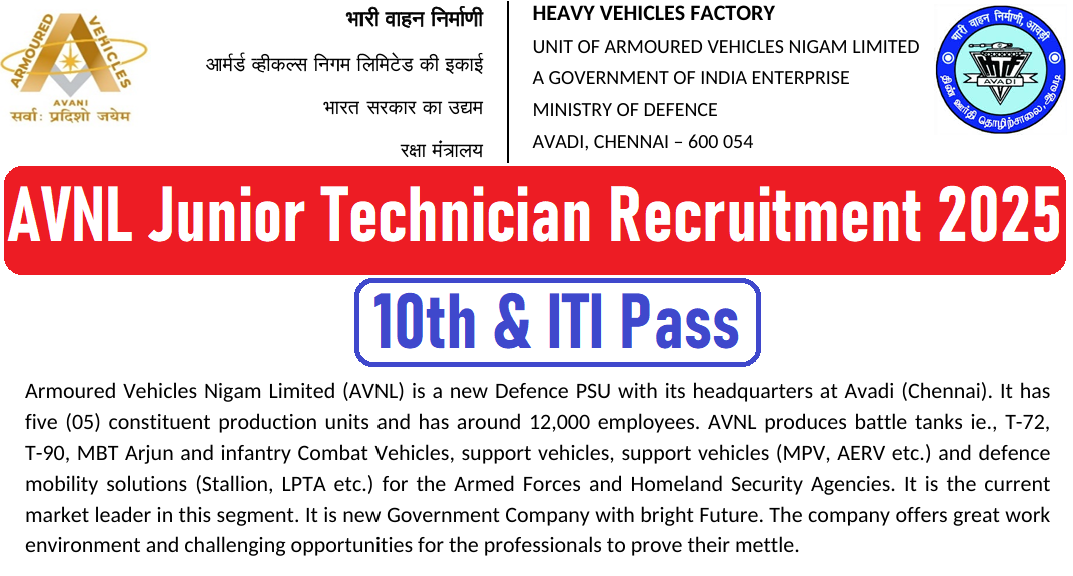 AVNL Junior Technician Recruitment 2025 : Armored Vehicles Nigam Limited (AVNL) की ओर से 98 Posts पर Recruitment निकली है जिसका Offline form शुरू है | AVNL Junior Technician Recruitment 2025 Offline form 01/11/2025 तक भरा जायेगा | 10th+ITI Pass in various candidates AVNL Junior Technician Recruitment 2025 offline form भर सकता है | Interested and eligible candidates AVNL Junior Technician Recruitment 2025 form भर सकते हैं | AVNL Junior Technician Recruitment Full Notification निचे दिया गया हैI AVNL Junior Technician Recruitment Apply Link निचे दिया गया है I