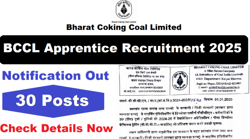 BCCL Apprentice Recruitment 2025 : Bharat Coking Coal Limited (BCCL) की ओर से 30 Posts पर Recruitment निकली है जिसका Offline form 03/01/2025 से शुरू है | BCCL Apprentice Recruitment 2025 Offline form 16/02/2025 तक भरा जायेगा |Diploma in Mining Engineering Pass candidates BCCL Apprentice Recruitment offline form भर सकता है | Interested and eligible candidates BCCL Apprentice Recruitment form भर सकते हैं |BCCL Apprentice Recruitment 2025 Full Notification निचे दिया गया है|