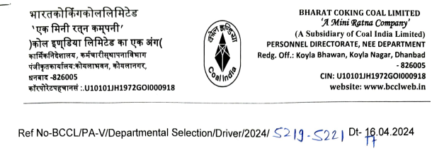 BCCL Driver Recruitment 2024, 29-04-2024 Last Date