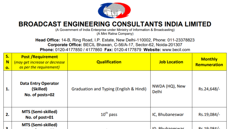 BECIL Recruitment 2024: Broadcast Engineering Consultants India Limited (BECIL) recruitment advertisement, dated 25.06.2024, invites applications for various positions on a contractual basis for deployment in NWDA (HQ) and field offices. The last date for submitting online applications is 09.07.2024.