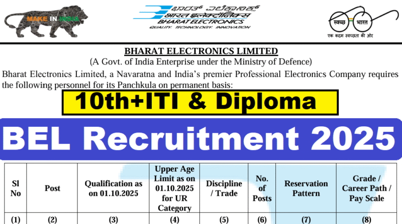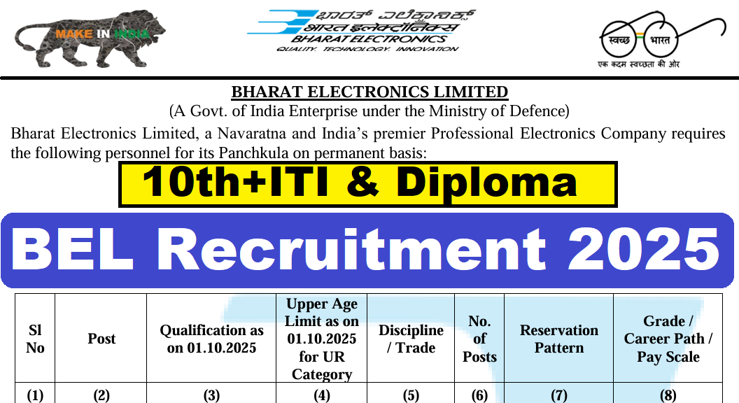 BEL Recruitment 2025 : Bharat Electronics Limited (BEL) की ओर से 15 Posts पर Recruitment निकली है जिसका Online form 15/10/2025 से शुरू है | BEL Recruitment 2025 Online form 04/11/2025 तक भरा जायेगा |10th+ITI & Diploma Pass in various candidates BEL Recruitment 2025 online form भर सकता है | Interested and eligible candidates BEL Recruitment 2025 form भर सकते हैं | BEL Recruitment Full Notification निचे दिया गया हैI BEL Recruitment Apply Link निचे दिया गया है I