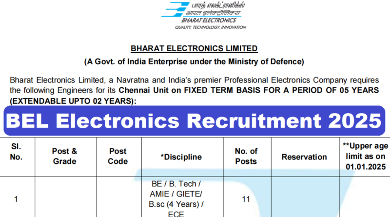 - Bharat Electronics Limited, a Navratna and India‟s premier Professional Electronics Company requires the following Engineers for its Chennai Unit on FIXED TERM BASIS FOR A PERIOD OF 05 YEARS (EXTENDABLE UPTO 02 YEARS):
