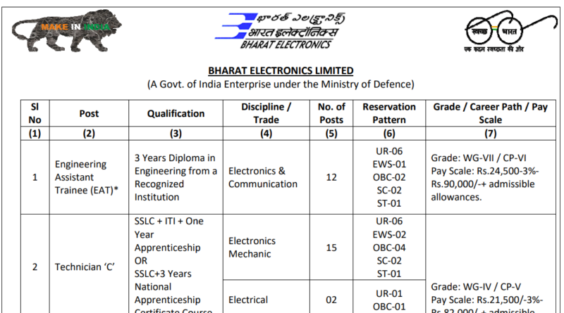 BEL Technician Recruitment 2024: Bharat Electronics Limited, a Navratna Company and India’s premier Professional Electronics Company requires the following personnel for its Electronic Warfare Naval Systems SBU of Hyderabad Unit on permanent basis.