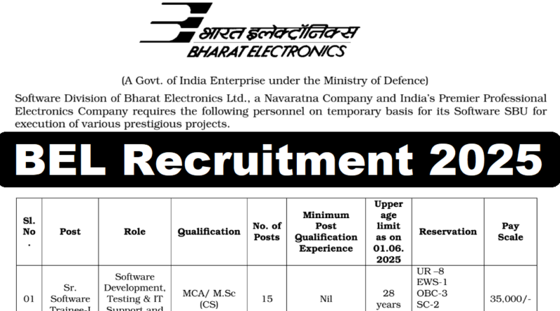 BEL Recruitment 2025, Software Trainee & Software Professional Latest Vacancy 2025, 30/06/2025 Last Date