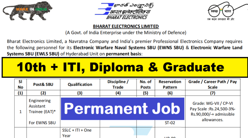 Bharat Electronics Limited, a Navratna Company and India’s premier Professional Electronics Company requires the following personnel for its Electronic Warfare Naval Systems SBU (EWNS SBU) & Electronic Warfare Land Systems SBU (EWLS SBU) of Hyderabad Unit on permanent basis: