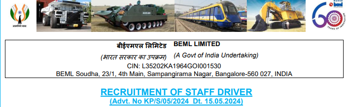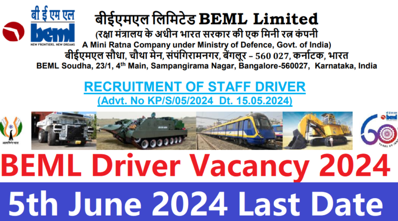 BEML Driver Recruitment 2024, 5th June 24 last Date