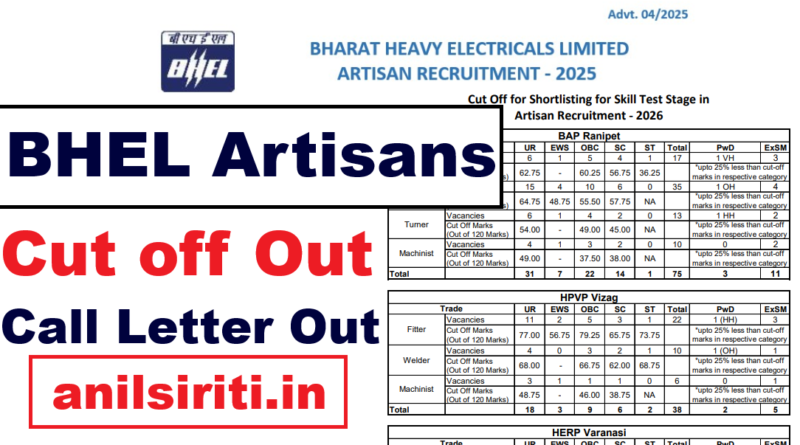 BHEL Artisan Recruitment 2026 के Skill Test के लिए Shortlisting Cut Off Marks जारी। Score Card और Call Letter अपने Personal Login से Check करें।