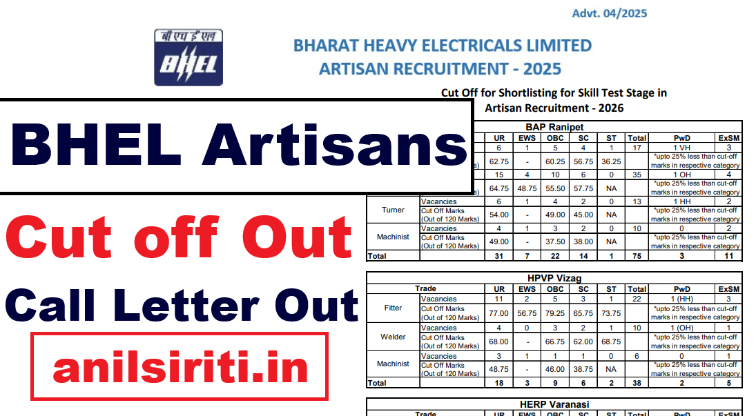 BHEL Artisans Official Cut off 2026 Out, BHEL Call letter for Skill test 2026 Out