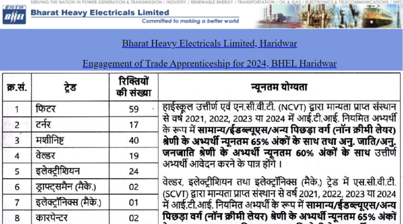 BHEL Haridwar Apprentice Recruitment 2024: BHEL Haridwar की ओर से ITI Pass candidates के लिए 170 सीटों पर Apprentice निकली है जिसका online form भरना शुरू हो गया। BHEL Haridwar Apprentice 2024 के लिए ITI Pass Fitter, Turner, Mashinist, Welder, Electrician, Draftsman Mechanical, Electronic mechanic,Carpenter, foundryman trade Apply कर सकते हैं । BHEL Haridwar Apprentice Application form 24 June 2024 तक भरा जाएगा।