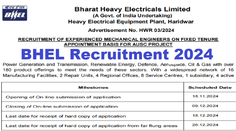BHEL Recruitment 2024, Graduate Latest Vacancy 2024, 18/12/2024 Last date