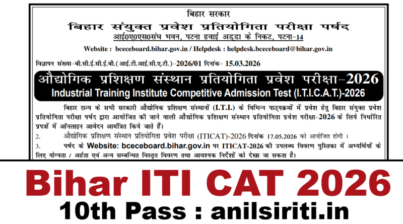 बिहार के सभी सरकारी औद्योगिक प्रशिक्षण संस्थानों (ITI) में Admission के लिए ITICAT 2026 Online Application शुरू। Exam Date: 17 May 2026। Apply करें — bceceboard.bihar.gov.in