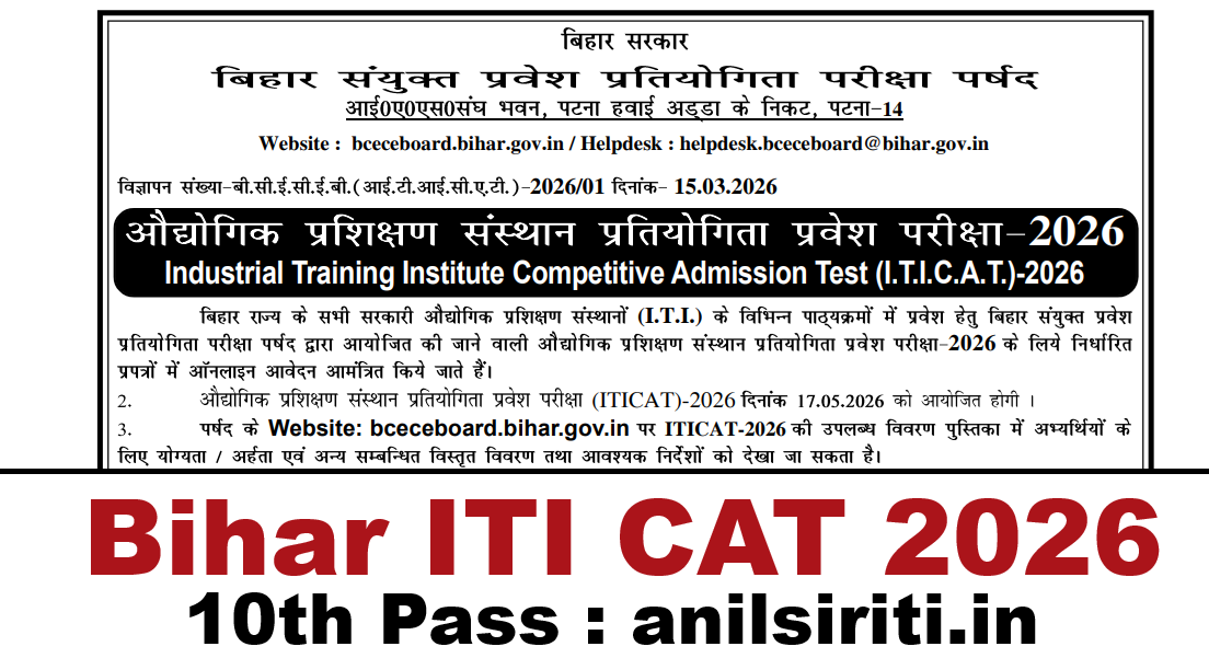 बिहार के सभी सरकारी औद्योगिक प्रशिक्षण संस्थानों (ITI) में Admission के लिए ITICAT 2026 Online Application शुरू। Exam Date: 17 May 2026। Apply करें — bceceboard.bihar.gov.in