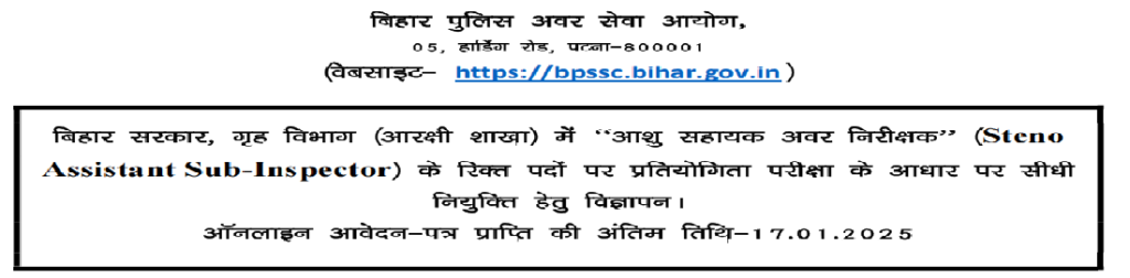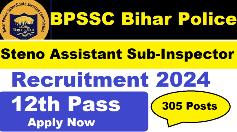 Bihar police Steno Recruitment 2024 : Bihar Police Subordinate Service Commission (BPSSC) की ओर से 305 Posts पर Recruitment निकली है जिसका Online form 17/12/2024 से शुरू है |BPSSC Bihar police Steno Recruitment 2024 Online form 17/01/2025 तक भरा जायेगा | 12th Pass candidates BPSSC Bihar police Steno Recruitment 2024 online form भर सकते है | Interested and eligible candidates BPSSC Bihar police Steno Recruitment 2024 form भर सकते हैं |BPSSC Bihar police Steno Recruitment 2024 का Notification Link निचे दी गई है |BPSSC Bihar police Steno Recruitment 2024 का Apply Link निचे दी गई है