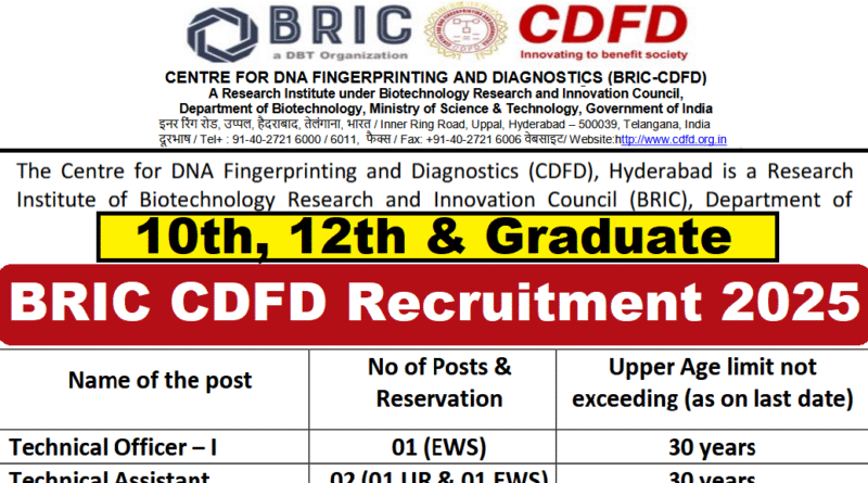 BRIC CDFD Recruitment 2025, 10th, 12th & Graduate Pass Latest Vacancy 2025, 30/09/2025 Last Date