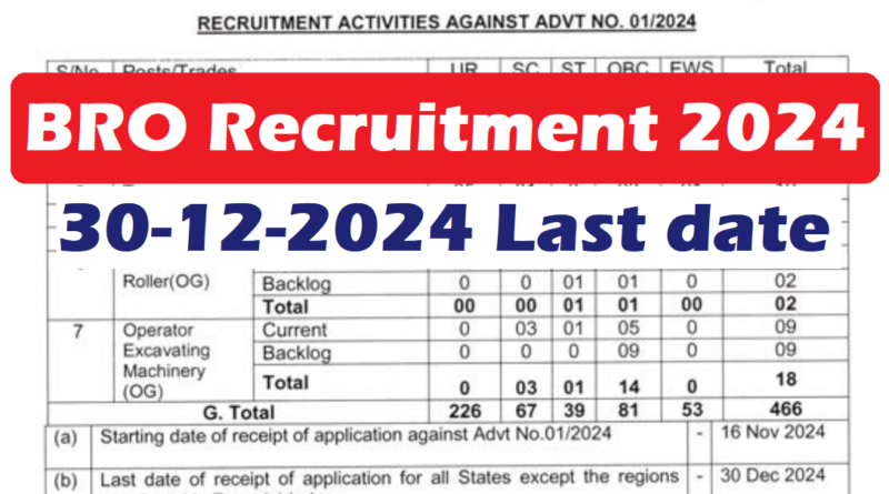 BRO GREF Recruitment 2024: Good news for 10th, ITI, Diploma, Border Roads Organisation (BRO) has been appointed for various positions such as Draughtsman, Supervisor (Administration), Turner, Machinist, Driver Mechanical Transport (OG), Driver Road Roller (OG) and Operator Excavating Machinery (OG). Candidates can know all the details about the BRO Vacancy 2024, including the required education, the application method, the eligibility requirements, age limit efficiency, the pay scale, and the departmental advertisement for this position. Border Roads Organisation (BRO) has been released the Full notification on 466 Vacancy against Advt. No. 01/2024 for 10th, 12th, ITI, Diploma & Degree Pass out Candidate on Permanent Basis. BRO Recruitment 2024 Offline form apply from 16-11-2024. BRO Recruitment Offline form apply before 30-12-2024.