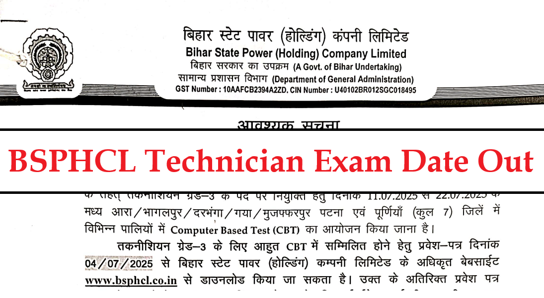 BSPHCL Technician III Exam Date Notice Out: BSPHCL Admit Card 2025 official link: Bihar State Power Holding Company Limited की ओर से ITI, Diploma, Graduate candidates के लिए Technician-III, Assistant Executive Engineer, Junior Electrical Engineer, Correspondence Clerk, Store Assistant, Junior Accountants Clerk Posts निकली है |BSPHCL Recruitment online form 19-07-2024 तक भरे गये थे| BSPHCL recruitment total 2610 posts पर निकली थी जिसका Exam नही हो पाया लेकिन BSPHCL Recruitment 2024 की seats बढ़ चुकी है | BSPHCL Recruitment 2024 Total 4016 Posts हो चुके हैं | BSPHCL Recruitment Online form 01-10-2024 से फिर भरा गया था | BSPHCL के Various Posts Exam date ओर Admit Card जारी कर दिया गया है | BSPHCL Technician III Recruitment 2025 CBT Exam 11-07-2025 to 22-07-2025 तक होगा | BSPHCL Technician III Admit Card 04-07-2025 को जारी किया जायेगा |