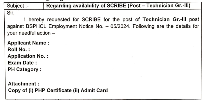 - दिव्यांगजन अधिकार अधिनियम के तहत् लिखने में असमर्थ अभ्यर्थी SCRIBE हेतु दिनांक 04/07/2025 से 06/07/2025 तक की अवधि में मात्र इस कार्य हेतु अधिकृत Email Id – bsphelscribe@gmail.com पर अनुरोध कर सकते है। आवेदक रजिस्टर्ड ईमेल के माध्यम से निम्न तथ्य अंकित कर PHP प्रमाण-पत्र एवं प्रवेश पत्र की प्रति संलग्न करते हुए अनुरोध प्रेषित करेंगे :-