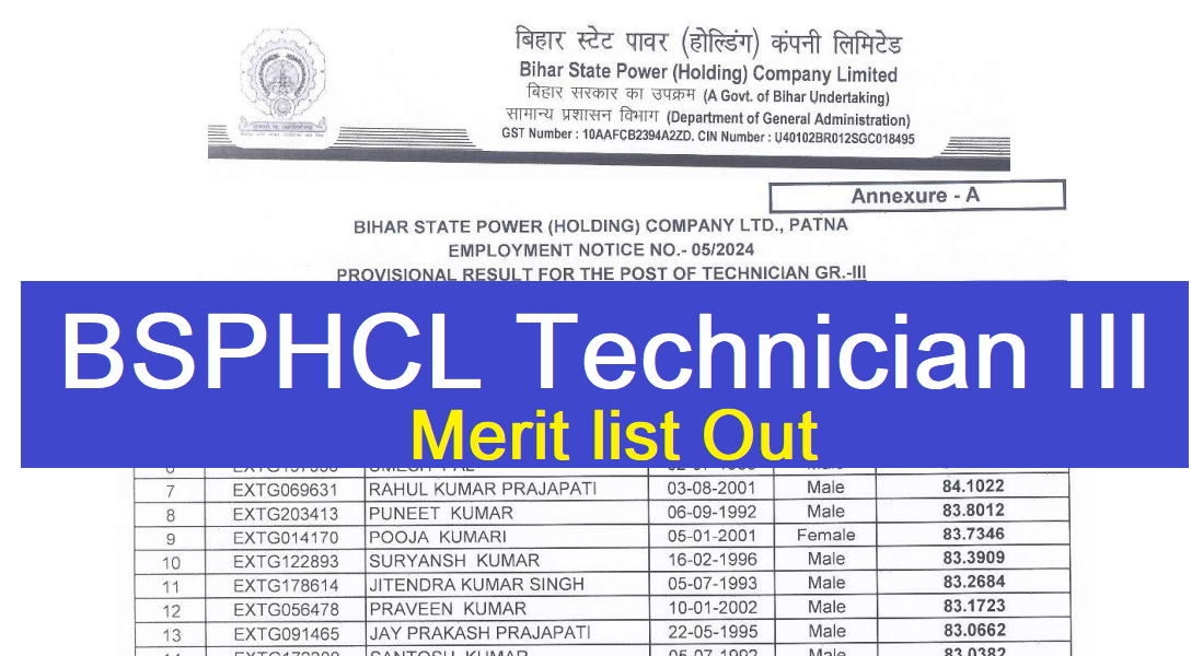 BSPHCL Technician III Merit list 2025 Out: Bihar State Power Holding Company Limited की ओर से Technician III की Recruitment निकली थी जिसका Online form 19-07-2024 तक भरा गया था जिसका Exam 11/07/2025 to 22/07/2025 तक होने के बाद आज Result और Merit list जारी कर दिया गया है | BSPHCL Technician III Recruitment 2025 Merit list निचे दिया गया है | BSPHCL Technician III Merit list में अपना नाम चेक करें |