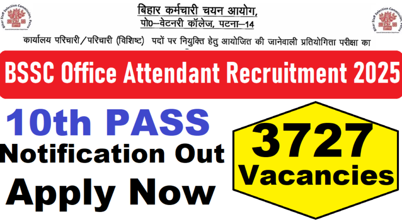 BSSC Office Attendant Recruitment 2025 : Bihar Staff Selection Commission (BSSC) की ओर से 3727 Posts पर Recruitment निकली है जिसका Online form 25/08/2025 से शुरू है | BSSC Office Attendant Recruitment 2025 Online form 24/09/2025 तक भरा जायेगा | 10th Pass in various candidates BSSC Office Attendant Recruitment 2025 online form भर सकता है | Interested and eligible candidates BSSC Office Attendant Recruitment 2025 form भर सकते हैं | BSSC Office Attendant Recruitment Full Notification निचे दिया गया हैI BSSC Office Attendant Recruitment Apply Link निचे दिया गया है I