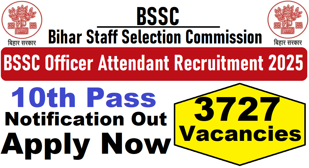 BSSC Officer Attendant Recruitment 2025 : Bihar Staff Selection Commission (BSSC) की ओर से 3727 Posts पर Recruitment निकली है जिसका Online form 25/08/2025 से शुरू है | BSSC Officer Attendant Recruitment 2025 Online form 26/09/2025 तक भरा जायेगा | 10th Pass in various candidates BSSC Officer Attendant Recruitment 2025 online form भर सकता है | Interested and eligible candidates BSSC Officer Attendant Recruitment 2025 form भर सकते हैं | BSSC Officer Attendant Recruitment Full Notification निचे दिया गया हैI BSSC Officer Attendant Recruitment Apply Link निचे दिया गया है I
