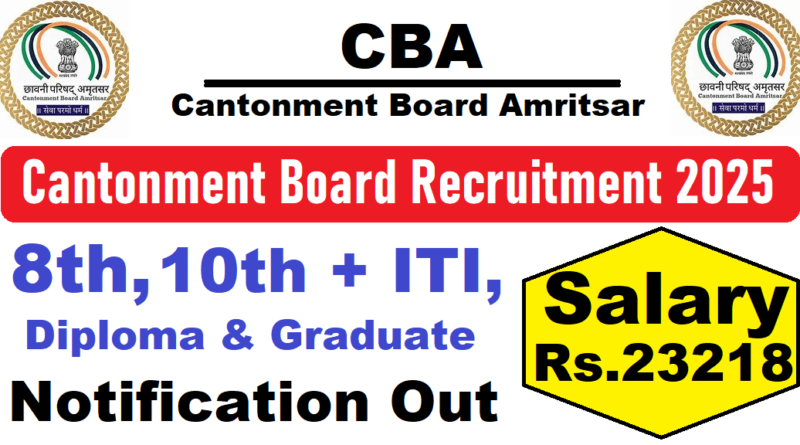 Cantonment Board Recruitment 2025 : Cantonment Board Amritsar की ओर से 06 Posts पर Recruitment निकली है जिसका Online form शुरू है | Cantonment Board Recruitment 2025 Online form 01/06/2025 तक भरा जायेगा | 8th, 10th+ITI, Diploma & Graduate Pass in various candidates Cantonment Board Recruitment 2025 online form भर सकता है | Interested and eligible candidates Cantonment Board Recruitment 2025 form भर सकते हैं | Cantonment Board Recruitment Full Notification निचे दिया गया हैI Cantonment Board Recruitment Apply Link निचे दिया गया है I
