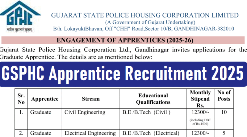 Read MoreGSPHC Apprentice Recruitment 2025 : Gujrat State Police Housing Corporation Limited (GSPHC) की ओर से 25 Posts पर Recruitment निकली