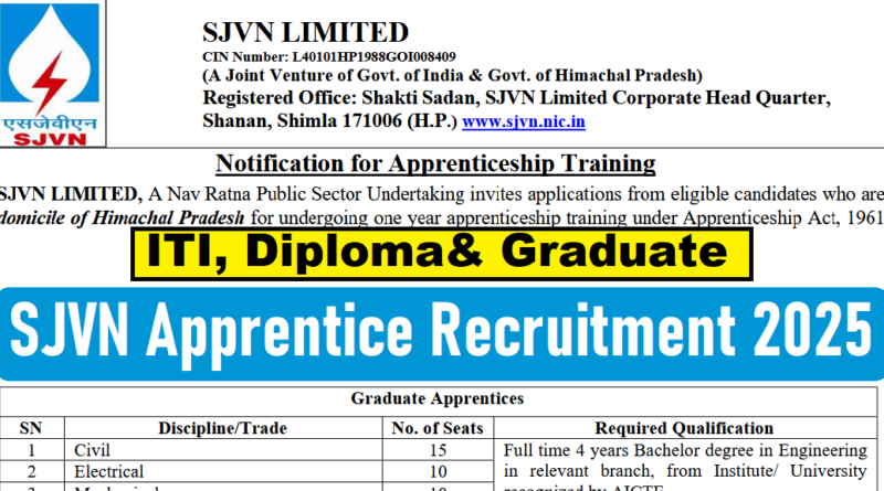 Read MoreSJVN Apprentice Recruitment 2025 : SJVN Limited की ओर से 100 Posts पर Recruitment निकली है जिसका Online form 26/12/2025