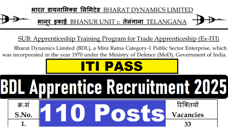 Read MoreBDL Apprentice Recruitment 2025 : Bharat Dynamics Limited (BDL) की ओर से 110 Posts पर Recruitment निकली है जिसका Online
