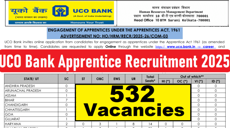 Read MoreUCO Bank Apprentice Recruitment 2025 : UCO Bank की ओर से 532 Posts पर Recruitment निकली है जिसका Online form