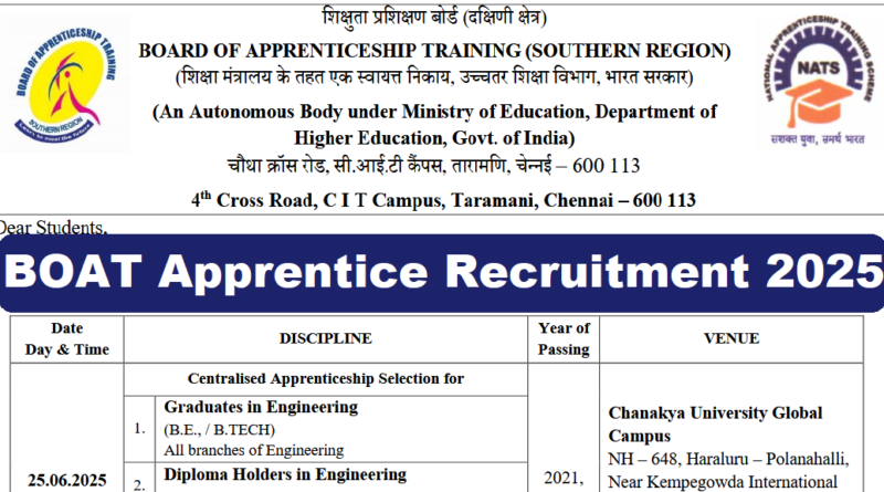 Read MoreBOAT Apprentice Recruitment 2025 : Board of Apprenticeship Training (Southern Region) की ओर से Apprenticeship Post पर Walk-In-Fair निकली है