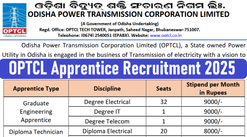 Read MoreOPTCL Apprentice Recruitment 2025 : Odisha Power Transmission Corporation Limited (OPTCL) की ओर से 100 Posts पर Recruitment निकली है