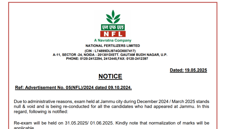 Read MoreNFL Recruitment Re-exam 2025 official notice out: NFL Non Executive Answer key 20254: National Fertilizers Limited की ओर से ITI,