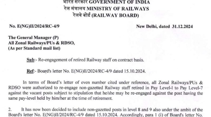 RRB RBE No. 115/2024 official notice out, Railway Re engaged level 1 to level 7 staff