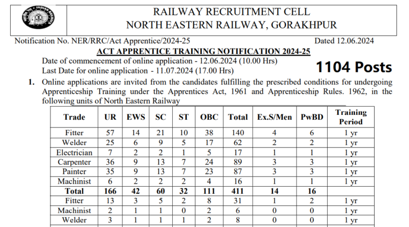 Read MoreNorth Eastern Railway Gorakhpur Apprentice 2024: RRC NER Gorakhpur की ओर से ITI Pass Candidates के लिए 1104 Posts पर