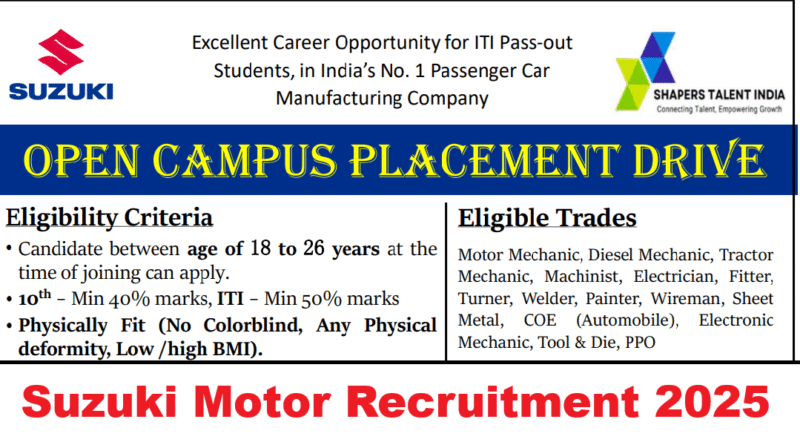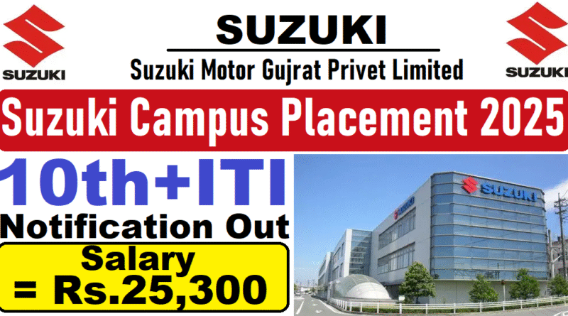 Read MoreSuzuki Campus Placement 2025 : Suzuki Motor Gujarat Private Limited की ओर से MMV, Diesel Mechanic, Tractor Mechanic, Machinist, Electrician,