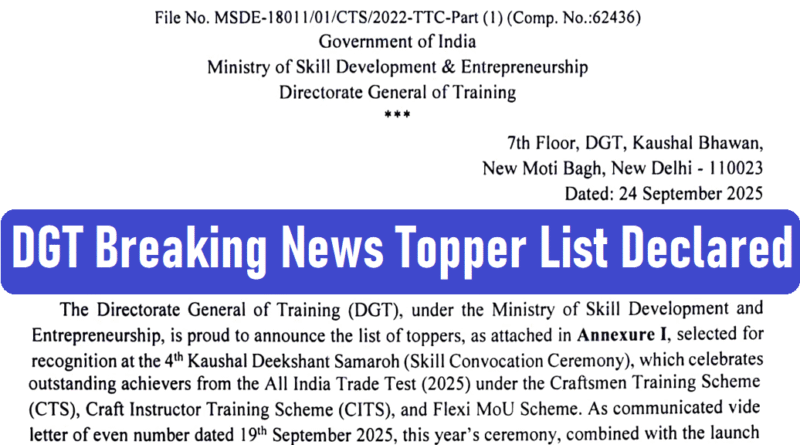 Read MoreDGT Breaking news : Directorate General of Training की ओर से All India Trade Test Toppers under the Craftsmen Training Scheme