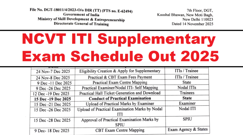 Read MoreNCVT ITI Supplementary Exam Schedule 2025 Out: It is informed that the leftover/supplementary examination-2025 of trainees under Craftsmen Training Scheme
