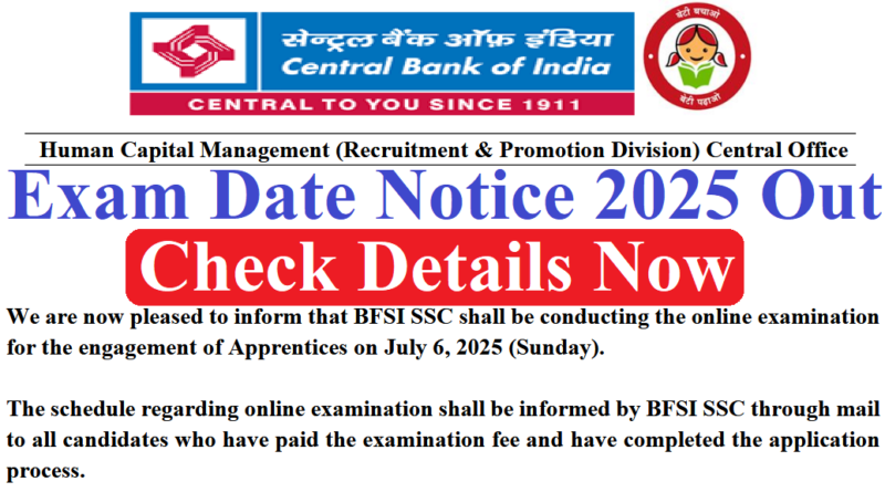Central Bank of India Apprentice 2025, Check Exam Date Notice Out 2025