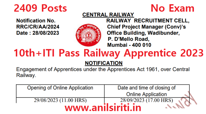 Central Railway Apprentice 2023-24, ITI Pass New Railway Apprentice 2023