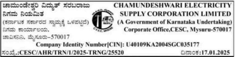 CESCOM Apprentice Recruitment 2025 : The Chamundeshwari Electricity Supply Corporation Limited Mysore (CESCOM) की ओर से 250 Posts पर Recruitment निकली है जिसका Online form 20/01/2025 से शुरू है | CESCOM Apprentice Recruitment 2025 Online form 06/02/2025 तक भरा जायेगा | Diploma, Graduate & Engineering pass in various candidates CESCOM Apprentice Recruitment online form भर सकता है | Interested and eligible candidates CESCOM Apprentice Recruitment form भर सकते हैं |CESCOM Apprentice Recruitment Full Notification निचे दिया गया हैI CESCOM Apprentice Recruitment 2025 Apply Link निचे दिया गया है I