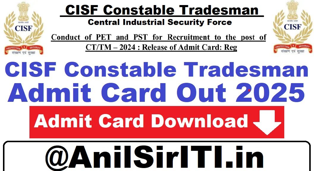 CISF Constable Tradesman Admit Card Out 2025 : Central Industrial Security Force (CISF) की ओर से 1161 Posts पर Recruitment निकली थी CISF Constable Tradesman Recruitment 2025 Online form 03/04/2025 तक भरा गया था I |Exam Form भरने के बाद सभी Candidates Admit Card का इंतज़ार कर रहे थे जिसका PET/PST Exam Date 26/09/2025 है जिसे Officially जारी कर दिया गया है और इसका Admit Card 17/09/2025 को जारी कर दिया गया है I Latest Update के लिए AnilSirITI Telegram Group Join जॉइन कर ले I